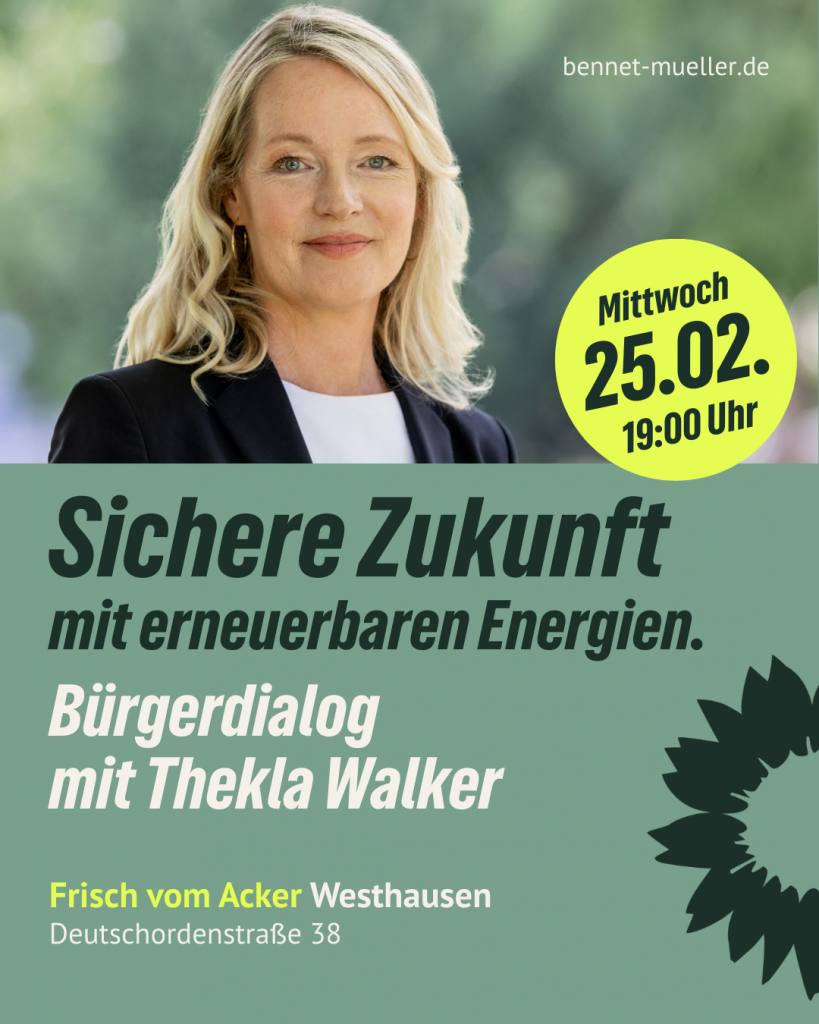 - Sichere Zukunft. Mit Erneuerbarer Energie – Bürgerdialog mit Thekla WalkerThekla Walker ist auf Einladung von Landtagskandidat Bennet Müller in Westhausen zu Gast. Wir laden Sie herzlich ein zum Austausch mit Thekla Walker und unserem Landtagskandidaten Bennet Müller.Über die Energiewende im Land und in den Kommunen, über Energiesicherheit, über Kosten.Wie die Sicherung unserer Zukunft gelingen kann. Wir freuen uns auf Ihre… Sichere Zukunft. Mit Erneuerbarer Energie – Bürgerdialog mit Thekla Walker weiterlesen