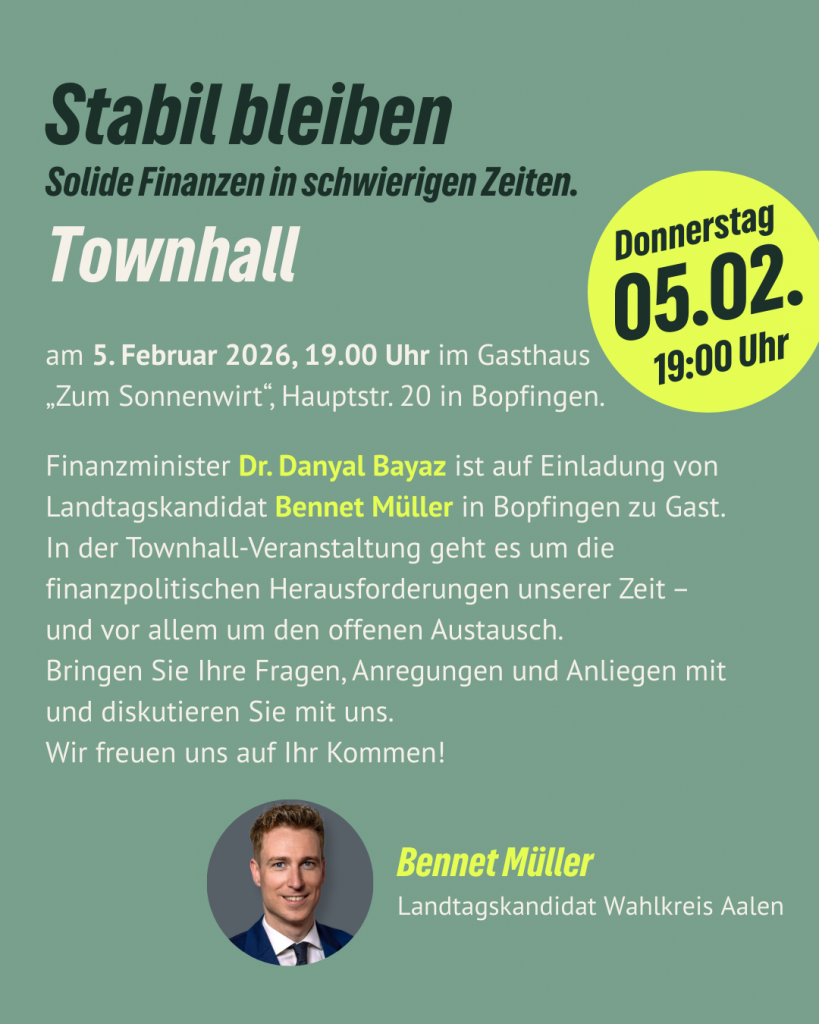 Unter dem Titel „Stabil bleiben: Solide Finanzen in schwierigen Zeiten“ ist Finanzminister Dr. Danyal Bayaz am 5. Februar in Bopfingen auf Einladung von Landratskandidat Bennet Müller zu Gast. In der Townhall-Veranstaltung geht es um die finanzpolitischen Herausforderungen unserer Zeit – und vor allem um den offenen Austausch. Bringen Sie Ihre Fragen, Anregungen und Anliegen mit und diskutieren Sie mit.